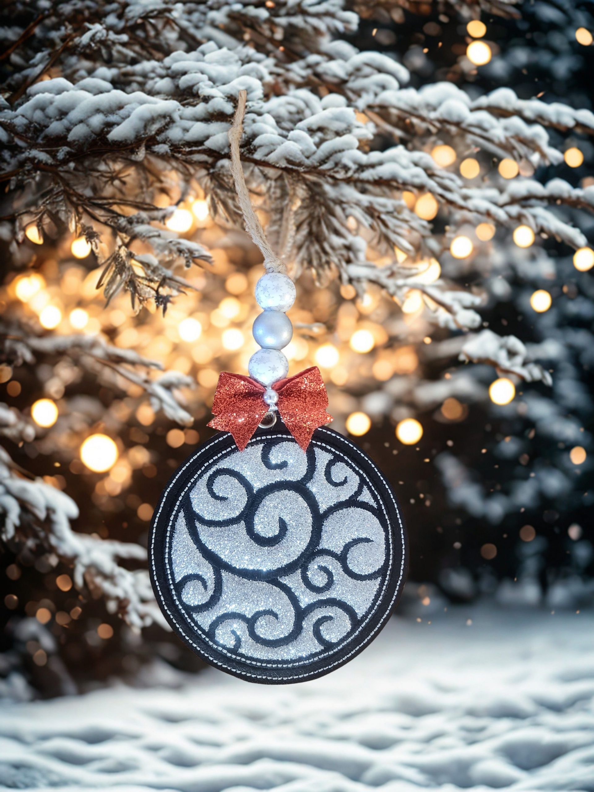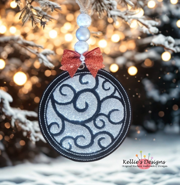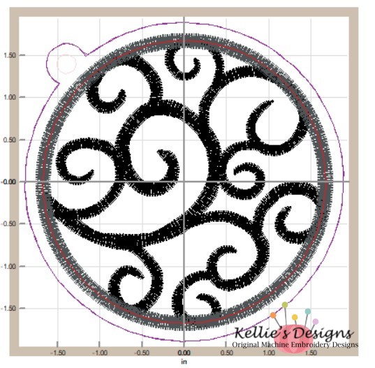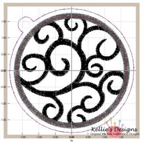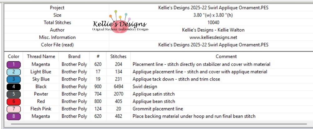Design Name: Kellie’s Designs 2025-22 Swirl Applique Ornament Number of different colors used in sew out: 7 Size: 3.80″(w) X 3.80″(h) (96.6 X 96.6mm) Total Stitches: 10040 |